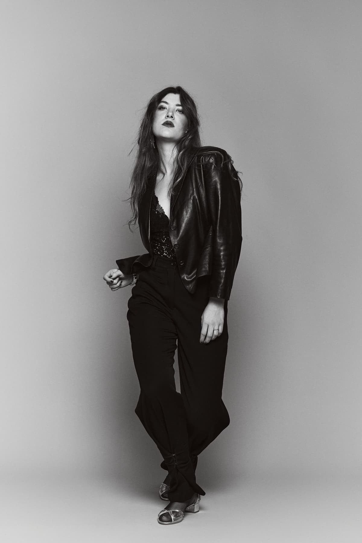 Carina de Vroome gestyled voor de filmpremière 'Jippie No More' geregisseerd door Margien Rogaar. About the look: Leather black jacket van Prada uit fall/ winter collectie 1994. The Golden Gucci shoes en afgestyled met een pantalon van Daily Paper. De Gucci schoenen zijn te huren op de Rental pagina.